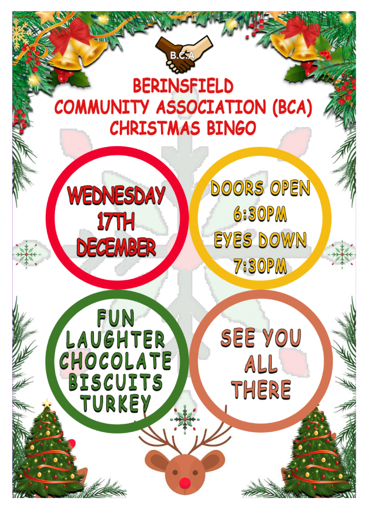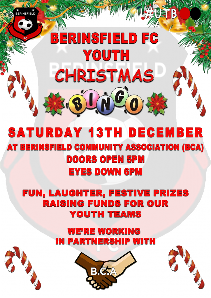 -Berinsfield FC Youth hold their Christmas Bingo on Saturday 13th December in the BCA Function Room. Doors open 5pm, eyes down 6pm. Please come along and support this great cause!!