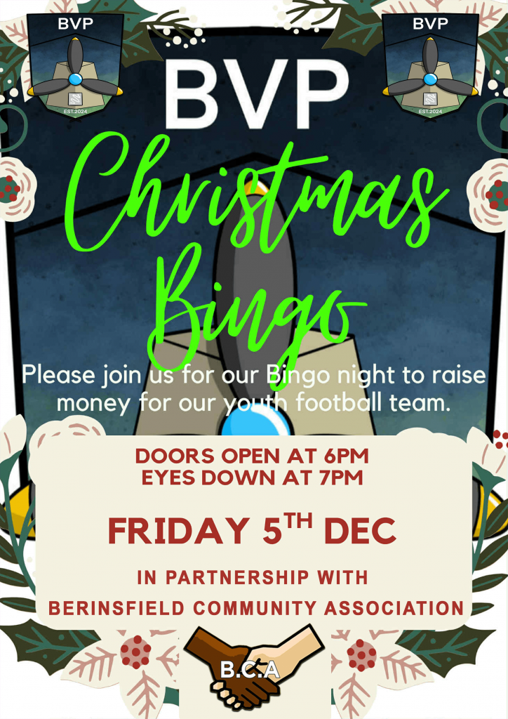 -Join us on the 5th December for a night of Christmas Bingo. This is to raise money for the BVP youth football team. Doors open at 6pm, eyes down at 7pm. Always a good night and we look forward to seeing you all.