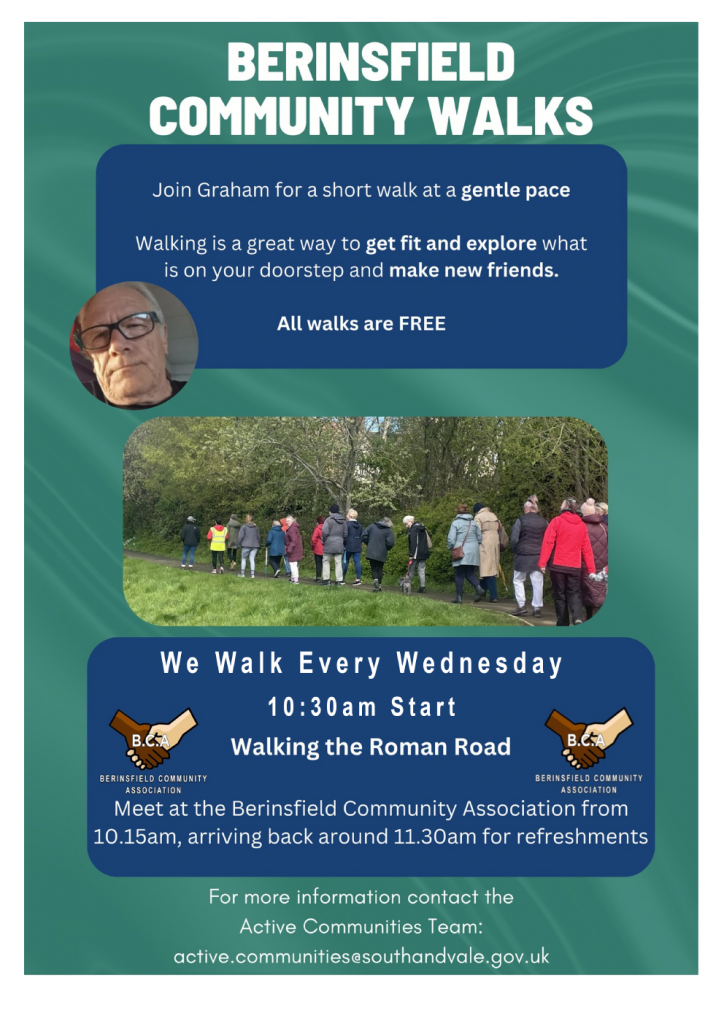 -Join Graham for a gentle walk starting from the Berinsfield Community Association (weather permitting). Keep an eye on this page and Facebook for further details. All welcome, no charge and a tea or coffee in the club after.