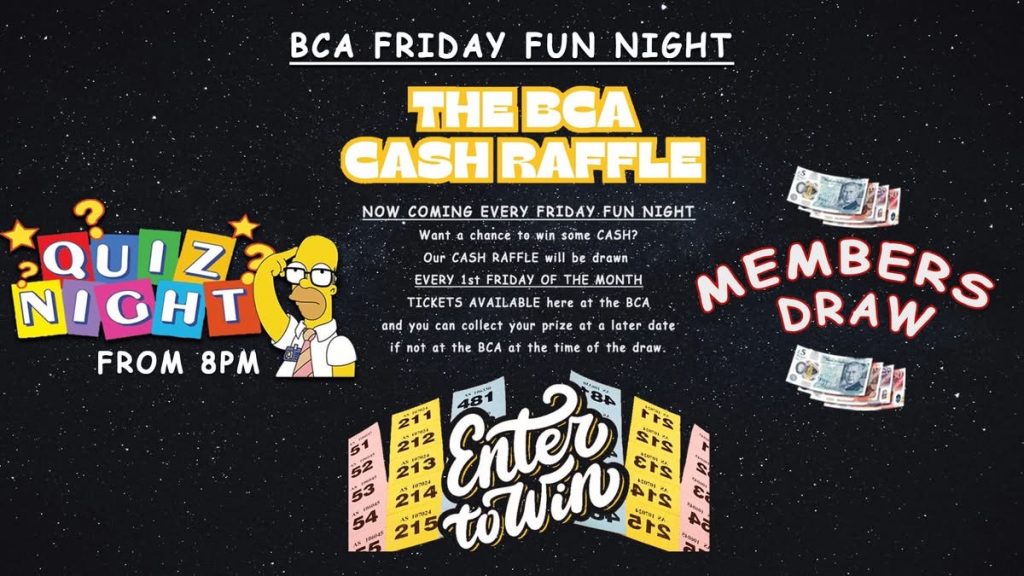 BCA First Friday Fun Night on the 8th February from 8PM . QUIZ NIGHT, CASH RAFFLE AND MEMBERS DRAW. It doesn’t get much better than that!!!
