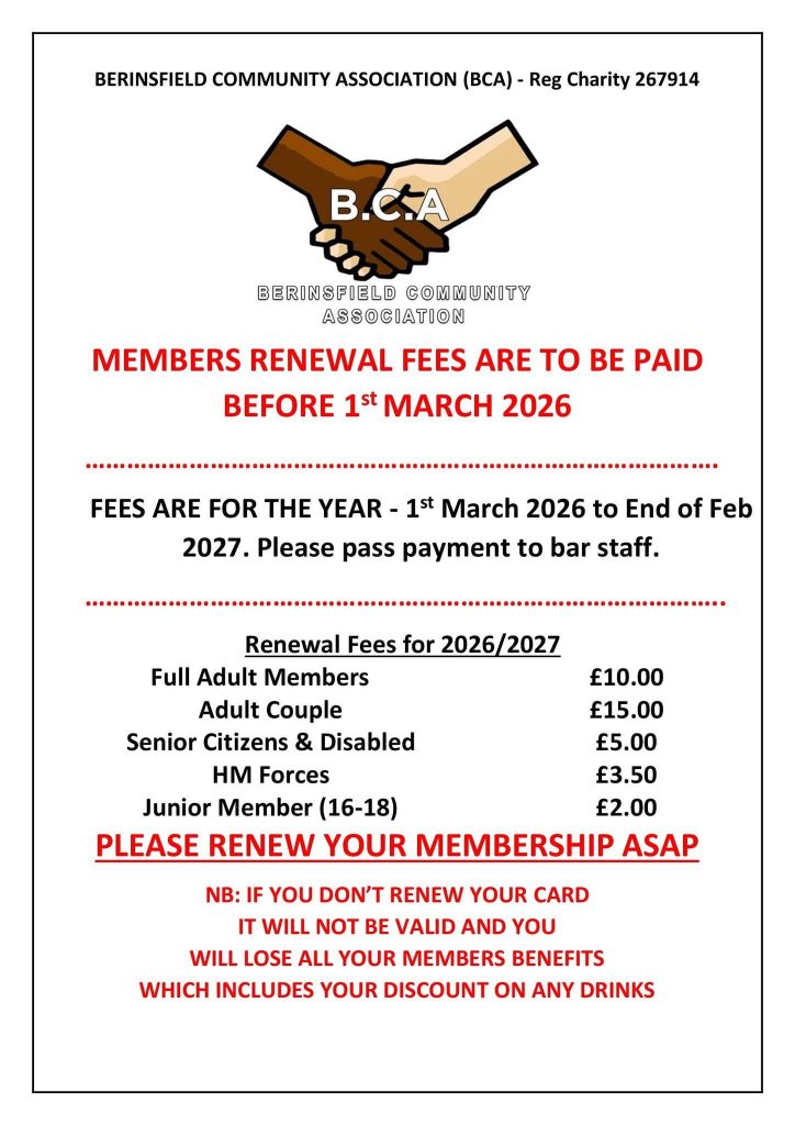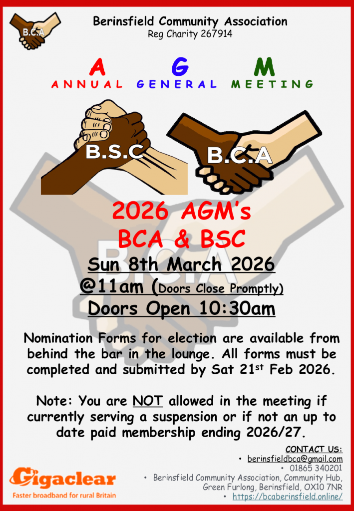 The Berinsfield Community Association and Social Club are holding their Annual General Meeting on the 8th March. Renewed members only and you must be in the meeting before 11 am. Doors shut promptly and latecomers are not admitted.